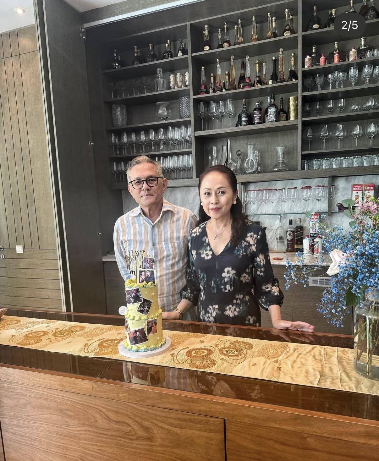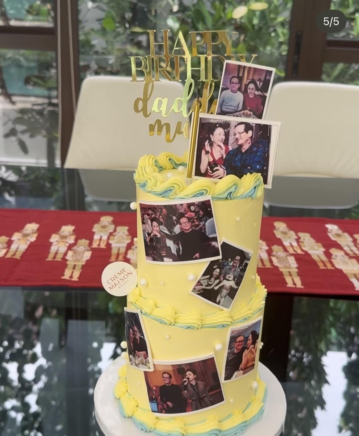 石贞善父母站吧台后合影,面前摆着双层蛋糕,上面贴满他们多年来的合照。两人没搂没抱,可那股默契劲儿谁都看得出来。爸爸穿竖纹衬衫、戴黑框眼镜,头发花白却打理得一丝不乱,年轻时绝对是个帅哥;妈妈一身黑底碎花长裙,妆容精致,气质温婉,一看就是岁月优待的人。